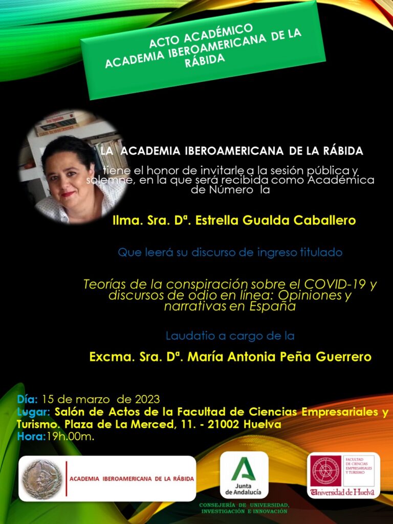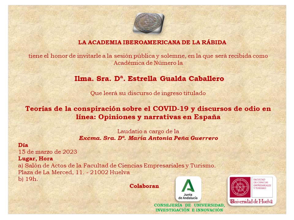 LA ACADEMIA IBEROAMERICANA DE LA RÁBIDA que debía haber celebrado sesión pública el próximo día 21 de febrero de 2023 para recibir como Académica de Número a la lma. Sra. Dª. Estrella Gualda Caballero que leerá su discurso de ingreso, Teorías de la conspiración sobre el COVID-19 y discursos de odio en línea: Opiniones y narrativas en España, se pospone para el día 15 de marzo de dos mil veintitrés.